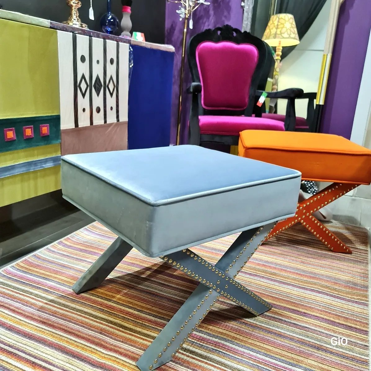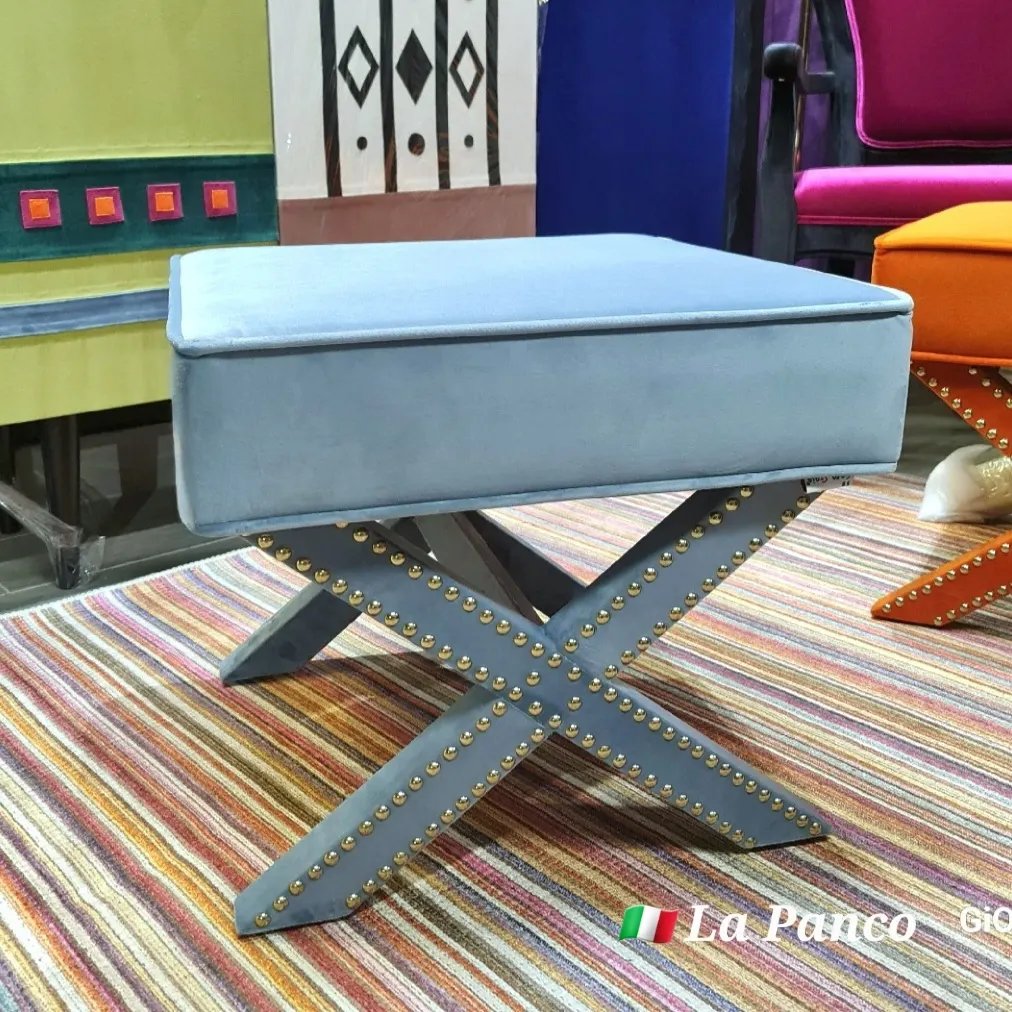 A modern stool bench finished in sky-blue velvet fabric and embedded with silver studs.
