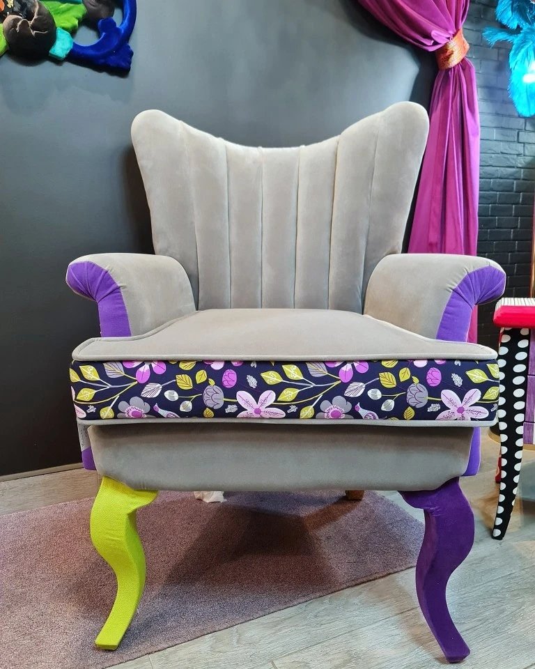 This classical marvel has been transformed into a sensational artwork. Finished matt grey velvet and other remarkable embroidered fabrics.
