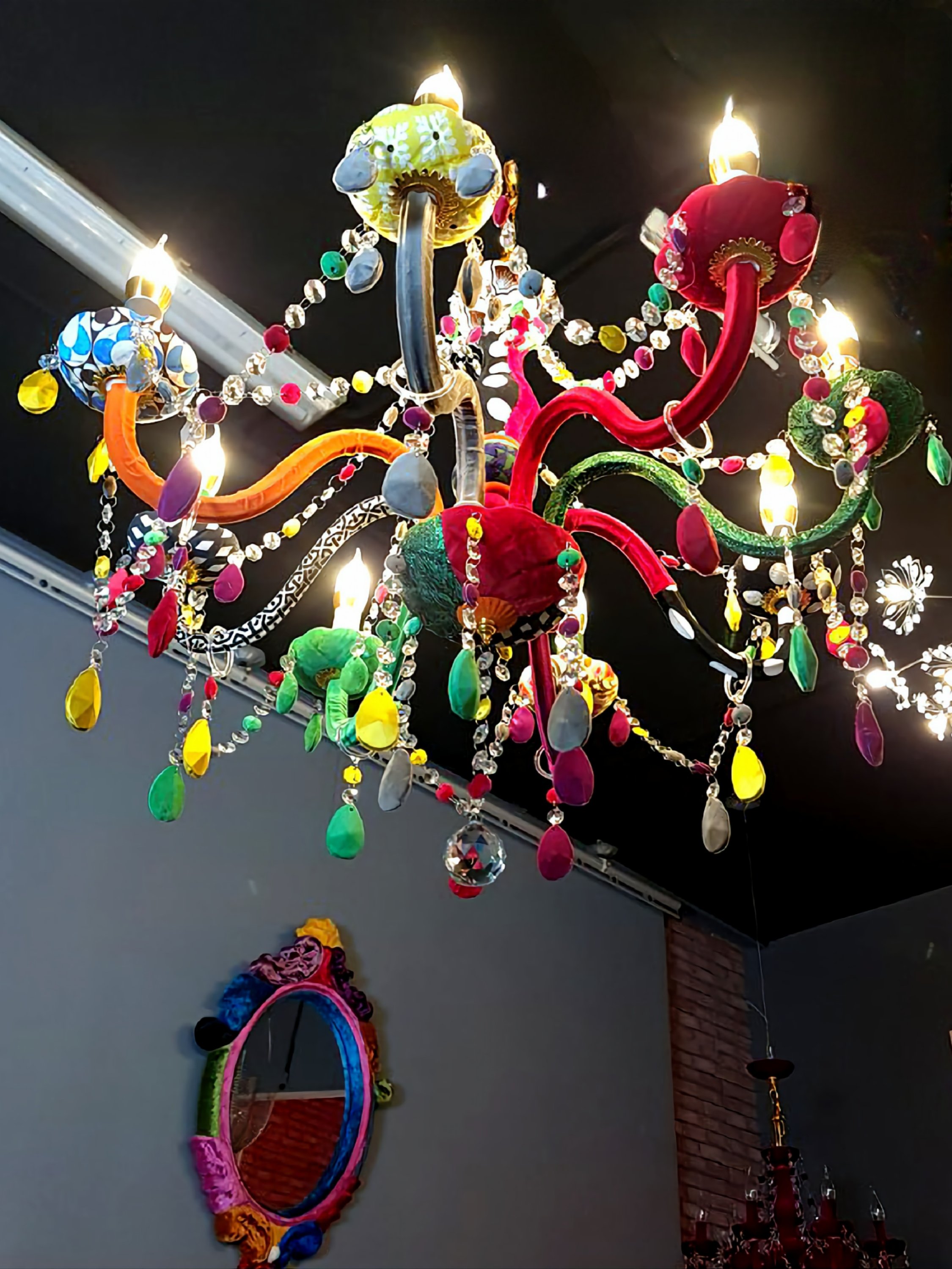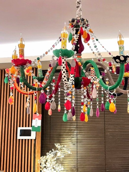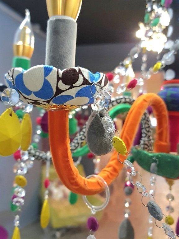 Pricole Lucci vibrant Chandelier. A bold design that comes from a classical unit then coated with multiple vibrant fabrics that transform it into an ultra modern piece of art. Amazing and head turning combination for your beloved space. Bellissima!