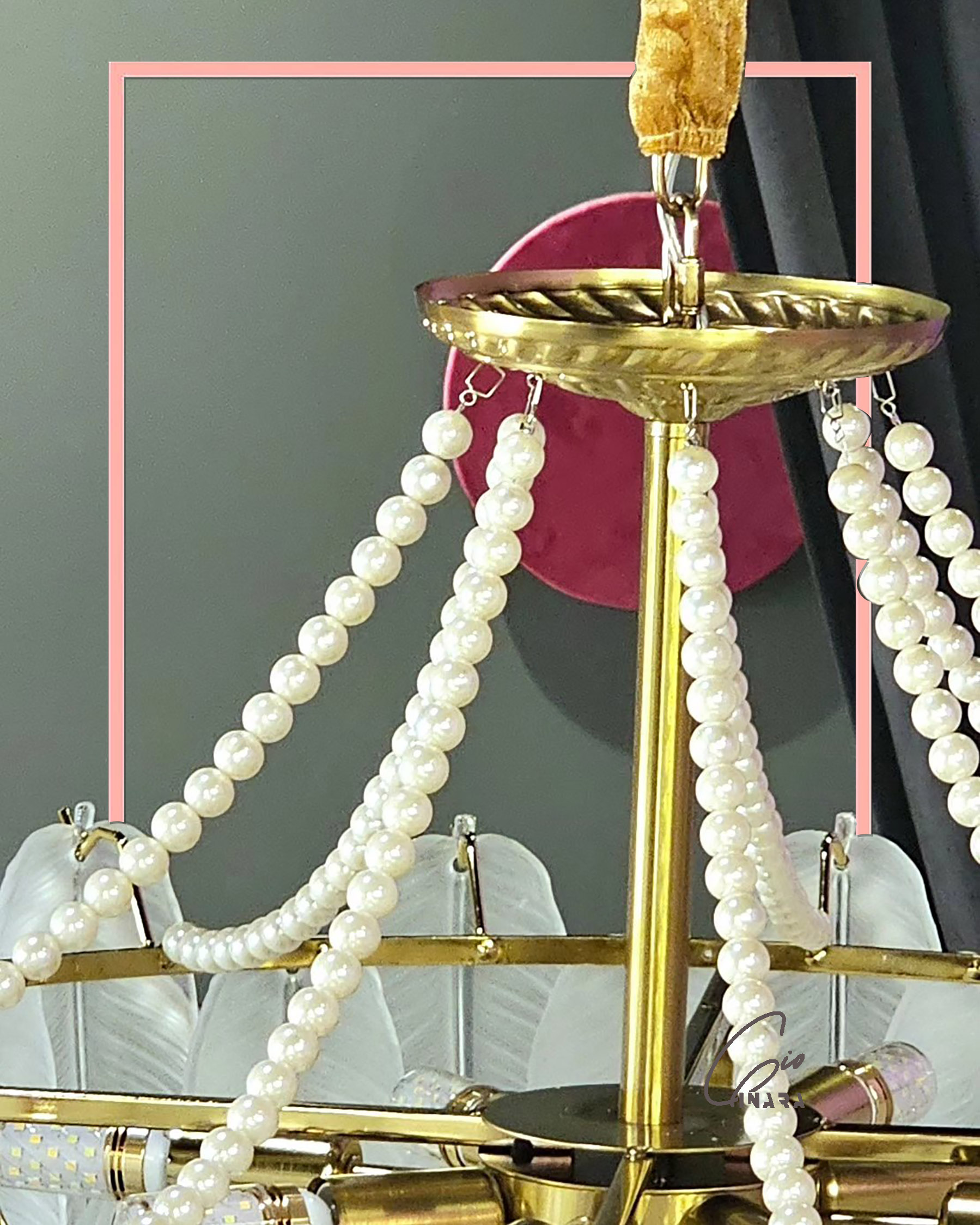 A sensational round chandelier with glass leaves and pearl chains embedded into a matt brushed gold color chassis.