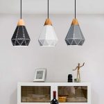 ضوء قلادة على شكل الماس مع تأثير خياطة. مصنوع من المعدن مع قاعدة علوية من الخشب، وتشطيب بألوان الباستيل الخفيفة بدون لمعة