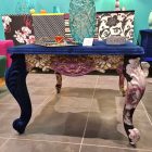 A spectacular classic style square table finished with royal blue velvet and various other perfectly selected fabrics